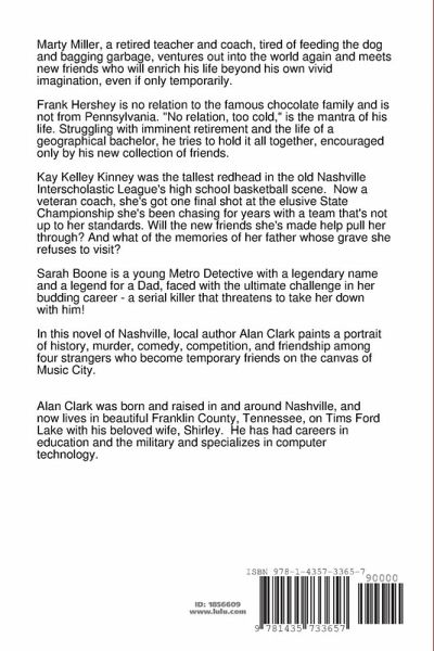 Against the backdrop of Nashville, Tennessee, local author Alan Clark depicts the lives of four strangers who become friends during a period of challenge in each of their lives. Will their new friendships help each other through their personal turmoil?