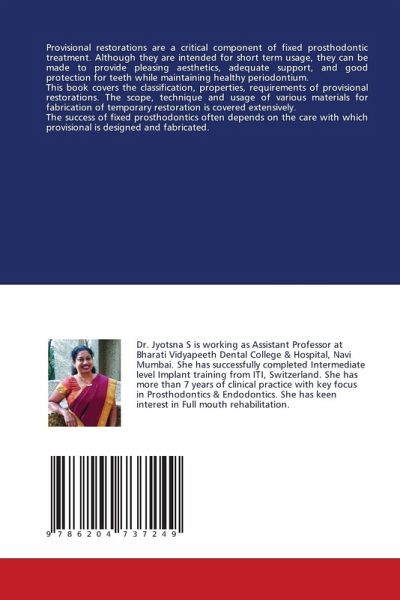 Provisional restorations are a critical component of fixed prosthodontic treatment. Although they are intended for short term usage, they can be made to provide pleasing aesthetics, adequate support, and good protection for teeth while maintaining healthy periodontium. This book covers the classification, properties, requirements of provisional restorations. The scope, technique and usage of various materials for fabrication of temporary restoration is covered extensively. The success of fixed prosthodontics often depends on the care with which provisional is designed and fabricated.