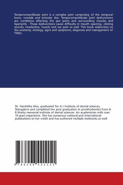 Temporomandibular joint is a complex joint comprising of the temporal bone, condyle and articular disc. Temporomandibular joint dysfunctions are conditions affecting the jaw joints and surrounding muscles and ligaments . These dysfunctions cause difficulty in mouth opening, clicking sounds, headaches, muscle and ear pain as well. This book elaborates on the anatomy, etiology, signs and symptoms, diagnosis and management of TMDs.