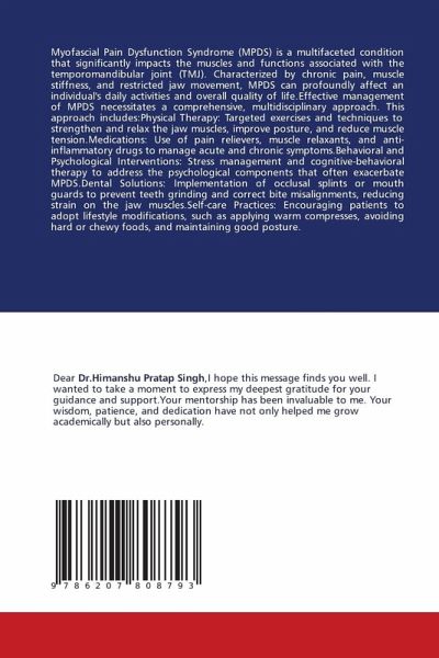 Myofascial Pain Dysfunction Syndrome (MPDS) is a multifaceted condition that significantly impacts the muscles and functions associated with the temporomandibular joint (TMJ). Characterized by chronic pain, muscle stiffness, and restricted jaw movement, MPDS can profoundly affect an individual's daily activities and overall quality of life.Effective management of MPDS necessitates a comprehensive, multidisciplinary approach. This approach includes:Physical Therapy: Targeted exercises and techniques to strengthen and relax the jaw muscles, improve posture, and reduce muscle tension.Medications: Use of pain relievers, muscle relaxants, and anti-inflammatory drugs to manage acute and chronic symptoms.Behavioral and Psychological Interventions: Stress management and cognitive-behavioral therapy to address the psychological components that often exacerbate MPDS.Dental Solutions: Implementation of occlusal splints or mouth guards to prevent teeth grinding and correct bite misalignments, reducing strain on the jaw muscles.Self-care Practices: Encouraging patients to adopt lifestyle modifications, such as applying warm compresses, avoiding hard or chewy foods, and maintaining good posture.