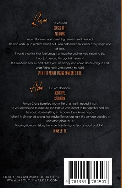 -Rowan- He was sad. Closed off. Alluring. Aiden Donovan was something I never knew I needed. He had walls up to protect himself, but I was determined to shatter every single one of them. I would show him that fate brought us together and we were meant to be. It was just me and him against the world. But someone from my past didn't want me happy and would do anything to end what Aiden and I were starting to build. Even if it meant taking someone's life. -Aiden- He was dominant. Addictive. Stubborn. Rowan Crane barrelled into my life at a time I needed it most. He was determined to make me see that we were meant to be together and that he would do everything in his power to make me happy. When I finally started seeing that maybe Rowan was right, the universe decided it had other plans for us. Knowing Rowan's history, the force threatening to tear us apart could win. If we let it.