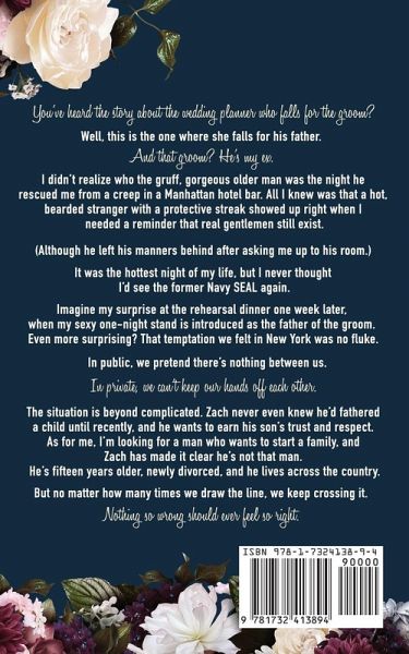 You've heard the story about the wedding planner who falls for the groom? Well, this is the one where she falls for his father. And that groom? He's my ex. I didn't realize who the gruff, gorgeous older man was the night he rescued me from a creep in a Manhattan hotel bar. All I knew was that a hot, bearded stranger with a protective streak showed up right when I needed a reminder that real gentlemen still exist. (Although he left his manners behind after asking me up to his room.) It was the hottest night of my life, but I never thought I'd see the former Navy SEAL again. Imagine my surprise at the rehearsal dinner one week later, when my sexy one-night stand is introduced as the father of the groom. Even more surprising? That temptation we felt in New York was no fluke. In public, we pretend there's nothing between us. In private, we can't keep our hands off each other. The situation is beyond complicated. Zach never even knew he'd fathered a child until recently, and he wants to earn his son's trust and respect. As for me, I'm looking for a man who wants to start a family, and Zach has made it clear he's not that man. He's fifteen years older, newly divorced, and he lives across the country. But no matter how many times we draw the line, we keep crossing it. Nothing so wrong should ever feel so right.