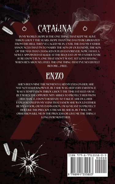 Catalina In my world, hope is the one thing that kept me alive throughout the years. Hope that one day I'd be liberated from the hell they've caged me in. Until the day my father announces that I'm to marry the son of our enemy. The son of the man that changed our lives forever. Now, I have a newly appointed stalker at the request of my father to be sure I don't run. One that I don't want, yet love having. When he's around, I feel the one thing that I've never felt before...free. Enzo She's been mine the moment I laid eyes on her. She may not have known it, but she was. Her very existence was a temptation throughout the time I stayed away. But when the opportunity arises to protect her from her fiancé, I don't hesitate to take it. She dug her fangs so deep in my veins that I knew she would either be my savior, or my damnation. I was meant to protect her like the precious treasure she is, but will my obsession kill me in the process or give me the very thing I long for most? Her.