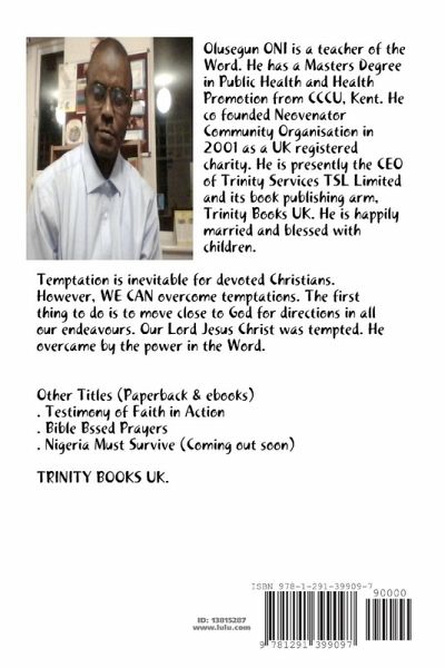 This book describes temptations and how to avoid temptations. There is no devout Christian that will not be tempted by Satan and his agents who go about looking for people to destroy. We need to move close to God and let him direct our step and also study the word so that it can become a lamp onto our paths. Hebrews 4:12 tells us of the power in the Word of God and its ability to discern the thoughts and intents of the heart. With the power in the Word of God, you will be able to know the plans of the enemy