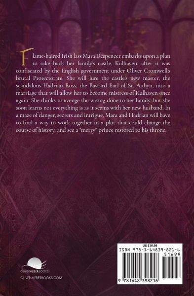 Flame-haired Irish lass Mara Despencer embarks upon a plan to take back her family's castle, Kulhaven, after it was confiscated by the English government under Oliver Cromwell's brutal Protectorate. She will lure the castle's new master, the scandalous Hadrian Ross, the Bastard Earl of St. Aubyn, into a marriage that will allow her to become mistress of Kulhaven once again. She thinks to avenge the wrong done to her family, but she soon learns not everything is as it seems with her new husband. In a maze of danger, secrets and intrigue, Mara and Hadrian will have to find a way to work together in a plot that could change the course of history, and see a "merry" prince restored to his throne.
