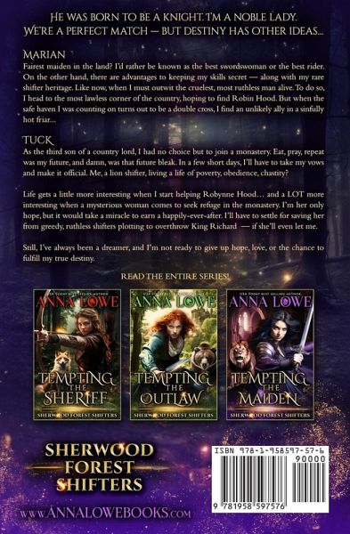 He was born to be a knight. I'm a noble lady. We're a perfect match - but destiny has other ideas... MARIAN Fairest maiden in the land? I'd rather be known as the best swordswoman or the best rider. On the other hand, there are advantages to keeping my skills secret - along with my rare shifter heritage. Like now, when I must outwit the cruelest, most ruthless man alive. To do so, I head to the most lawless corner of the country, hoping to find Robin Hood. But when the safe haven I was counting on turns out to be a double cross, I find an unlikely ally in a sinfully hot friar... TUCK As the third son of a country lord, I had no choice but to join a monastery. Eat, pray, repeat was my future, and damn, was that future bleak. In a few short days, I'll have to take my vows and make it official. Me, a lion shifter, living a life of poverty, obedience, chastity? Life gets a little more interesting when I start helping Robynne Hood... and a LOT more interesting when a mysterious woman comes to seek refuge in the monastery. I'm her only hope, but it would take a miracle to earn a happily-ever-after. I'll have to settle for saving her from greedy, ruthless shifters plotting to overthrow King Richard - if she'll even let me. Still, I've always been a dreamer, and I'm not ready to give up hope, love, or the chance to fulfill my true destiny. SHERWOOD FOREST SHIFTERS Steamy, suspenseful paranormal romance! Book 1: Tempting the Sheriff Book 2: Tempting the Outlaw Book 3: Tempting the Maiden A steamy, suspenseful paranormal romance series that corrects all the errors of the Robin Hood legends. If you enjoyed the humor of The Princess Bride and the action-packed romance of Outlander, you'll love this fresh new twist on a classic, complete with brave knights, cunning bandits, fire-breathing dragons, and forbidden lovers.