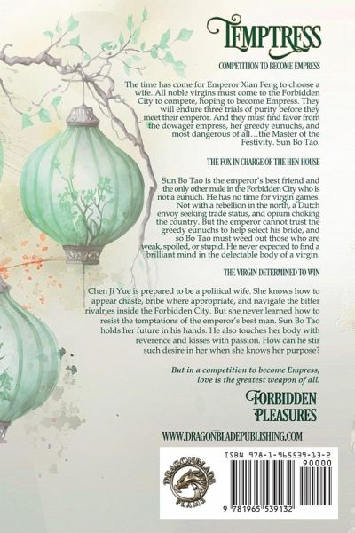 COMPETITION TO BECOME EMPRESS The time has come for Emperor Xian Feng to choose a wife. All noble virgins must come to the Forbidden City to compete, hoping to become Empress. They will endure three trials of purity before they meet their emperor. And they must find favor from the dowager empress, her greedy eunuchs, and most dangerous of all...the Master of the Festivity. Sun Bo Tao. THE FOX IN CHARGE OF THE HEN HOUSE Sun Bo Tao is the emperor's best friend and the only other male in the Forbidden City who is not a eunuch. He has no time for virgin games. Not with a rebellion in the north, a Dutch envoy seeking trade status, and opium choking the country. But the emperor cannot trust the greedy eunuchs to help select his bride, and so Bo Tao must weed out those who are weak, spoiled, or stupid. He never expected to find a brilliant mind in the delectable body of a virgin. THE VIRGIN DETERMINED TO WIN Chen Ji Yue is prepared to be a political wife. She knows how to appear chaste, bribe where appropriate, and navigate the bitter rivalries inside the Forbidden City. But she never learned how to resist the temptations of the emperor's best man. Sun Bo Tao holds her future in his hands. He also touches her body with reverence and kisses with passion. How can he stir such desire in her when she knows her purpose? But in a competition to become Empress, love is the greatest weapon of all. Forbidden Pleasures Book 1 - Vixen Book 2 - Temptress