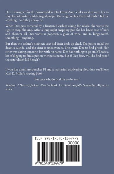 Read the series that Sinfully Scandalous Mysteries readers call ..."A highly original plot." "Swift, smart, and enjoyable!" "Captivating & masterful!" Dez is a magnet for the downtrodden. Her Great Aunt Violet used to warn her to stay clear of broken and damaged people. But a sign on her forehead reads, "Tell me anything." And they always do. When Dez gets cornered by a frustrated cashier asking for advice, she wants the sign to stop blinking. After a long night snapping pics for her latest case of liars and cheaters, all Dez wants is popcorn, a glass of wine, and to binge-watch something-anything. But then, the cashier's 19-year-old sister ends up dead. The police ruled the death a suicide. But the sister is unconvinced and wants Dez to find proof. ¿The cashier's sister was dating someone, but with no name, Dez has nothing to go on. It'll take a lot of digging to find a person without a name. But if Dez does, will she find proof the sister didn't kill herself? If you like compelling reads with a pull-no-punches PI, then you'll love author Kori D. Miller's riveting book. Filled with well-developed characters and a strong female lead, it provides a great distraction from everyday life. Tempus: A Dezeray Jackson Novel is book 3 in Kori's Sinfully Scandalous Mysteries series. Fans of Janet Evanovich, Sue Grafton, or Marcia Muller, will love getting to know PI Dezeray Jackson. She's smart, sassy, and has a penchant for weapons, good-looking men, and a great game of pool. And only one of those helps her solve cases. **The first three books in the Sinfully Scandalous Mysteries series are best read in order, but only because of the well-developed subplot. Yeah, there's one of those! Two mysteries in one. But I promise you'll know who did what by the end of Tempus. But will you figure it out before Dez? Buy TEMPUS and put your whodunit skills to the test!