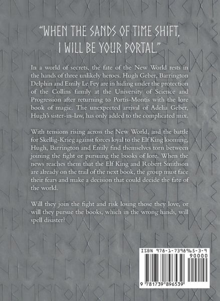 "When the sands of time shift, I Will be your portal." In a world of secrets, the fate of the New World rests in the hands of three unlikely heroes. Hugh Geber, Barrington Delphin and Emily Le Fey are in hiding under the protection of the Collins family at the University of Science and Progression after returning to Portis-Montis with the lore book of magic. The unexpected arrival of Adelia Geber, Hugh's sister-in-law, has only added to the complicated mix. With tensions rising across the New World, and the battle for Skellig-Krieg against forces loyal to the Elf King looming, Hugh, Barrington and Emily find themselves torn between joining the fight or pursuing the books of lore. When the news reaches them that the Elf King and Robert Smithson are already on the trail of the next book, the group must face their fears and make a decision that could decide the fate of the world. Will they join the fight and risk losing those they love, or will they pursue the books, which in the wrong hands, will spell disaster?