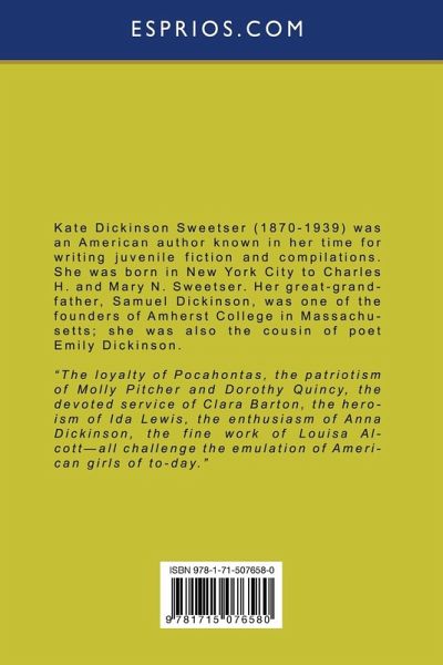 Kate Dickinson Sweetser (1870-1939) was an American author known in her time for writing juvenile fiction and compilations. She was born in New York City to Charles H. and Mary N. Sweetser. Her great-grandfather, Samuel Dickinson, was one of the founders of Amherst College in Massachusetts; she was also the cousin of poet Emily Dickinson. "The loyalty of Pocahontas, the patriotism of Molly Pitcher and Dorothy Quincy, the devoted service of Clara Barton, the heroism of Ida Lewis, the enthusiasm of Anna Dickinson, the fine work of Louisa Alcott-all challenge the emulation of American girls of to-day."