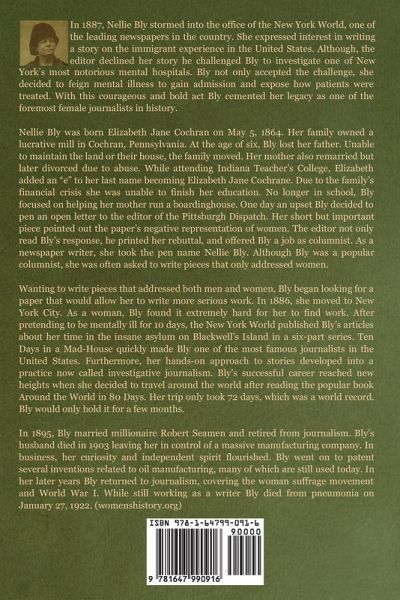 In 1887, Nellie Bly stormed into the office of the New York World, one of the leading newspapers in the country. She expressed interest in writing a story on the immigrant experience in the United States. Although, the editor declined her story he challenged Bly to investigate one of New York’s most notorious mental hospitals. Bly not only accepted the challenge, she decided to feign mental illness to gain admission and expose how patients were treated. With this courageous and bold act Bly cemented her legacy as one of the foremost female journalists in history. Nellie Bly was born Elizabeth Jane Cochran on May 5, 1864. Her family owned a lucrative mill in Cochran, Pennsylvania. At the age of six, Bly lost her father. Unable to maintain the land or their house, the family moved. Her mother also remarried but later divorced due to abuse. While attending Indiana Teacher’s College, Elizabeth added an "e" to her last name becoming Elizabeth Jane Cochrane. Due to the family’s financial crisis she was unable to finish her education. No longer in school, Bly focused on helping her mother run a boardinghouse. One day an upset Bly decided to pen an open letter to the editor of the Pittsburgh Dispatch. Her short but important piece pointed out the paper’s negative representation of women. The editor not only read Bly’s response, he printed her rebuttal, and offered Bly a job as columnist. As a newspaper writer, she took the pen name Nellie Bly. Although Bly was a popular columnist, she was often asked to write pieces that only addressed women. Wanting to write pieces that addressed both men and women, Bly began looking for a paper that would allow her to write more serious work. In 1886, she moved to New York City. As a woman, Bly found it extremely hard for her to find work. After pretending to be mentally ill for 10 days, the New York World published Bly’s articles about her time in the insane asylum on Blackwell’s Island in a six-part series. Ten Days in a Mad-House quickly made Bly one of the most famous journalists in the United States. Furthermore, her hands-on approach to stories developed into a practice now called investigative journalism. Bly’s successful career reached new heights when she decided to travel around the world after reading the popular book Around the World in 80 Days. Her trip only took 72 days, which was a world record. Bly would only hold it for a few months. In 1895, Bly married millionaire Robert Seamen and retired from journalism. Bly’s husband died in 1903 leaving her in control of a massive manufacturing company. In business, her curiosity and independent spirit flourished. Bly went on to patent several inventions related to oil manufacturing, many of which are still used today. In her later years Bly returned to journalism, covering the woman suffrage movement and World War I. While still working as a writer Bly died from pneumonia on January 27, 1922. (womenshistory.org)
