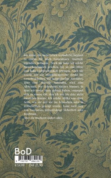 Die Reise, die mein Leben veränderte, beginnt in einem für mich Namenlosen Stadtteil, irgendwo in Lagos. Noch nie habe ich solche Menschenmassen gesehen, nie so eine Hitze und hohe Luftfeuchtigkeit ertragen. Noch nie wurde mir ein Maschinengewehr direkt ins Gesicht gehalten. Die neunstündige Autofahrt, über eine mir skurrile Autobahn, wird zum Albtraum. Der Geburtsort meines Mannes, in dem wir unser Haus gebaut haben, entpuppt sich zu einem Ort, den ich mir bis dato nicht vorstellen konnte. Ich erlebe Afrika von einer Seite, wie sie mir nie im Fernsehen oder in Zeitschriften gezeigt wurde. Ganz weit weg von Tourismus, Infrastruktur, Sicherheit oder Reichtum.Aber die Hochzeit ändert alles.