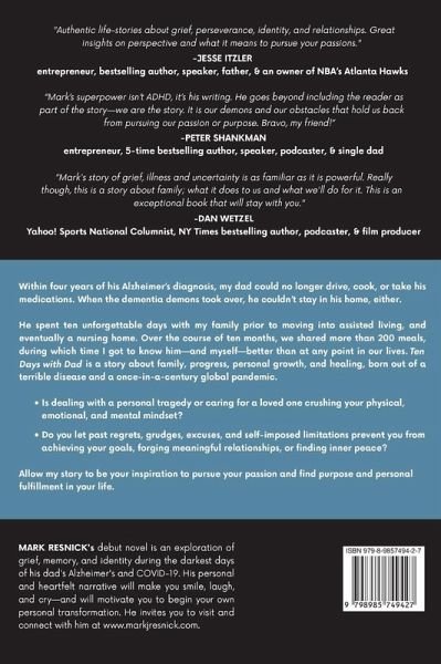 Have you ever learned more from someone in ten days than you did during their entire lifetime? What if that person was your father as he battled Alzheimer's during a global pandemic? Within four years of his Alzheimer's diagnosis, my dad could no longer drive, cook, or take his medications. When the dementia demons took over, he couldn't stay in his home, either. He spent ten unforgettable days with my family prior to moving into assisted living, and eventually a nursing home. Over the course of eighteen months, we shared more than 200 meals and 600 cups of coffee, during which time I got to know him-and myself-better than at any point in our lives. During the darkest days of COVID-19 and my dad's Alzheimer's, his memory, dignity, and, ultimately, his life were stolen from him. So how did I find purpose, passion, and peace in my life? Ten Days with Dad is a story about family, progress, personal growth, and healing, born out of a terrible disease and a once-in-a-century global pandemic. Is dealing with a personal tragedy or caring for a loved one crushing your physical, emotional, and mental mindset? Do you let past regrets, grudges, excuses, and self-imposed limitations prevent you from achieving your goals, forging meaningful relationships, or finding inner peace? What obstacles, perceived or otherwise, are preventing you from becoming the best version of yourself? Are you looking for practical and effective routines to build better habits, improve your mindset, and transform your priorities? How can you find purpose, passion, and personal fulfillment in your life right now? Get motivated to wake up each day a little happier and more grateful than the day before, and a lot more fulfilled in the buckets of your life that matter most. Allow my story to be your inspiration to pursue your passion and find purpose and fulfillment in your life. Because it's never too late-or early-to pursue your passion.