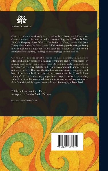 Can ten dollars a week truly be enough to keep house well? Catherine Owen answers this question with a resounding yes in "Ten Dollars Enough: Keeping House Well on Ten Dollars a Week; How It Has Been Done; How It May Be Done Again." This enduring guide to frugal living and household management offers practical advice and time-tested strategies for budgeting, cooking, and managing personal finance. Owen delves into the art of home economics, providing insights into efficient shopping, resourceful cooking techniques, and clever methods for making every dollar count. Explore real-life examples and proven methods for achieving financial stability and creating a comfortable home, even on a limited income. Discover the timeless wisdom within these pages and learn how to apply these principles to your own life. "Ten Dollars Enough" offers a fascinating glimpse into a bygone era while providing valuable lessons that remain relevant today for anyone seeking to improve their financial well-being and master the art of managing a household. This work has been selected by scholars as being culturally important, and is part of the knowledge base of civilization as we know it. This work is in the public domain in the United States of America, and possibly other nations. Within the United States, you may freely copy and distribute this work, as no entity (individual or corporate) has a copyright on the body of the work. Scholars believe, and we concur, that this work is important enough to be preserved, reproduced, and made generally available to the public. We appreciate your support of the preservation process, and thank you for being an important part of keeping this knowledge alive and relevant.