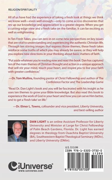 All of us have had the experience of taking a fresh look at things we think we know well-even well enough-only to come across discoveries that rev up our knowledge and appreciation to a greater degree. When you get a cutting-edge view and a fresh take on the familiar, it can be exciting as well as enlightening. In Ten Fresh Takes, you can zero in on some new perspectives on key issues that are vital to understanding and experiencing the authentic Christian life. Through ten stirring images that express those themes, these fresh takes reinforce some truths of which you may already be aware, or they will help you explore new directions in your thinking about basic matters of faith. "Put aside whatever you're reading now and read this book. Dan has captured ten of the main themes of Christian thought and action in a unique approach that will stir your mind, touch your heart, and inspire you to live your faith with greater confidence." -Dr. Tom Mullins, founding pastor of Christ Fellowship and author of The Confidence Factor and The Leadership Game "Read Dr. Dan Light's book and you will be fascinated with his insight as he uses ten themes to grow your Bible knowledge. But also read this book to experience the work of God in your heart and how you can serve Him better, and to get a 'fresh take' on life." -Dr. Elmer L. Towns, cofounder and vice president, Liberty University, and best-selling author