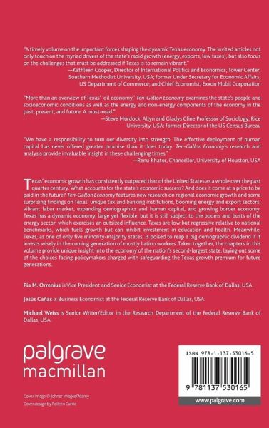 "Ten-Gallon Economy is a timely volume on the important forces shaping the dynamic Texas economy over the past decade and more. The invited articles touch on the myriad drivers of the state's rapid growth (energy, exports, low taxes), but they also focus on the challenges that need addressing if Texas is to remain vibrant. The volume is not a compendium of Texas boosterism but rather of clear-eyed research and recommendations to assure future economic success for all Texans."