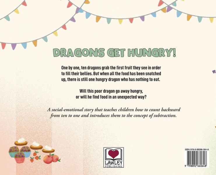 Dragons get hungry! One by one, ten dragons grab the first fruit they see in order to fill their bellies. But when all the food has been snatched up, there is still one hungry dragon who has nothing to eat. Will this poor dragon go away hungry, or will he find food in an unexpected way? A social-emotional story that teaches children how to count backward from ten to one and introduces them to the concept of subtraction.