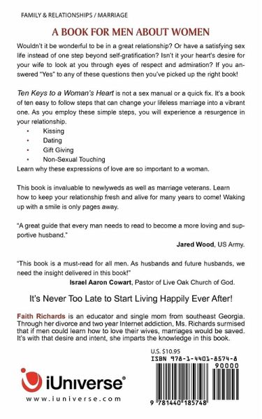 A BOOK FOR MEN ABOUT WOMEN Wouldn't it be wonderful to be in a great relationship? Or have a satisfying sex life instead of one step beyond self-gratification? Isn't it your heart's desire for your wife to look at you with eyes of admiration? If you answered "Yes" to any of these questions then you've picked up the right book! Ten Keys to a Woman's Heart is not a sex manual or a quick fix. It's a book of ten easy to follow steps that can change your lifeless marriage into a vibrant one. As you employ these simple steps, you will experience a resurgence in your relationship that is fulfilling and satisfying to you both. Waking up with a smile is only pages away. This book is invaluable to newlyweds as well as marriage veterans. Learn how to keep your relationship fresh and alive for many years to come! ¿ Kissing ¿ Dating ¿ Gift Giving ¿ Non-Sexual Touching Learn why these expressions of love are so important to a woman. "A great guide that every man needs to read to become a more loving and supportive husband." Jared Wood, US Army. "This book is a must-read for all men. As husbands and future husbands, we need the insight delivered in this book!" Israel Aaron Cowart, Pastor of Live Oak Church of God.