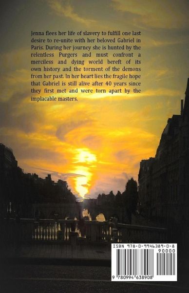 Jenna flees her life of slavery to fulfil one last desire to re-unite with her beloved Gabriel in the timeless city of Paris. During her journey she is hunted by the relentless Purgers and must confront a dying world bereft of its own history. In her heart lies the fragile hope that Gabriel is still alive after 40 years since they were torn away from each other by the implacable masters, urging her on through crippling doubts and the haunting demons of her past.