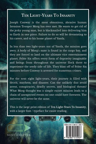 Joseph Conway is the most obnoxious, abrasive human Invasion Trooper Morg has ever met. He wants to get rid of the jerky young man, but is blackmailed into delivering him to Earth in one piece. Failure to do so will be devastating to his career, and to his home planet of Yanda. In less than two light-years out of Yanda, the mission goes awry. A body of Morg's mate is found in the cargo bay, and they are forced to land on the ultimate vice entertainment planet. Feltte Six offers every form of depravity imaginable and beings from throughout the universe flock there to experience the seedy side of life. They blast off of Feltte Six minutes before Conway is arrested for numerous crimes. For the next eight light-years, their journey is filled with deceit, mayhem, and disaster. Can the unlikely duo avoid arrest, conspiracies, deadly secrets, and biological threats? What Morg thought was a simple escort mission leads to a chain of unexpected events no one could have foreseen. The universe will never be the same. This is the large print edition of Ten Light-Years To Insanity, with a larger font / typeface for easier reading.