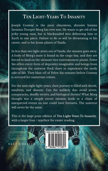 Joseph Conway is the most obnoxious, abrasive human Invasion Trooper Morg has ever met. He wants to get rid of the jerky young man, but is blackmailed into delivering him to Earth in one piece. Failure to do so will be devastating to his career, and to his home planet of Yanda. In less than two light-years out of Yanda, the mission goes awry. A body of Morg's mate is found in the cargo bay, and they are forced to land on the ultimate vice entertainment planet. Feltte Six offers every form of depravity imaginable and beings from throughout the universe flock there to experience the seedy side of life. They blast off of Feltte Six minutes before Conway is arrested for numerous crimes. For the next eight light-years, their journey is filled with deceit, mayhem, and disaster. Can the unlikely duo avoid arrest, conspiracies, deadly secrets, and biological threats? What Morg thought was a simple escort mission leads to a chain of unexpected events no one could have foreseen. The universe will never be the same. This is the large print edition of Ten Light-Years To Insanity, with a larger font / typeface for easier reading.