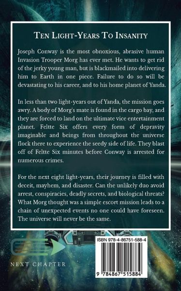 Joseph Conway is the most obnoxious, abrasive human Invasion Trooper Morg has ever met. He wants to get rid of the jerky young man, but is blackmailed into delivering him to Earth in one piece. Failure to do so will be devastating to his career, and to his home planet of Yanda. In less than two light-years out of Yanda, the mission goes awry. A body of Morg's mate is found in the cargo bay, and they are forced to land on the ultimate vice entertainment planet. Feltte Six offers every form of depravity imaginable and beings from throughout the universe flock there to experience the seedy side of life. They blast off of Feltte Six minutes before Conway is arrested for numerous crimes. For the next eight light-years, their journey is filled with deceit, mayhem, and disaster. Can the unlikely duo avoid arrest, conspiracies, deadly secrets, and biological threats? What Morg thought was a simple escort mission leads to a chain of unexpected events no one could have foreseen. The universe will never be the same.
