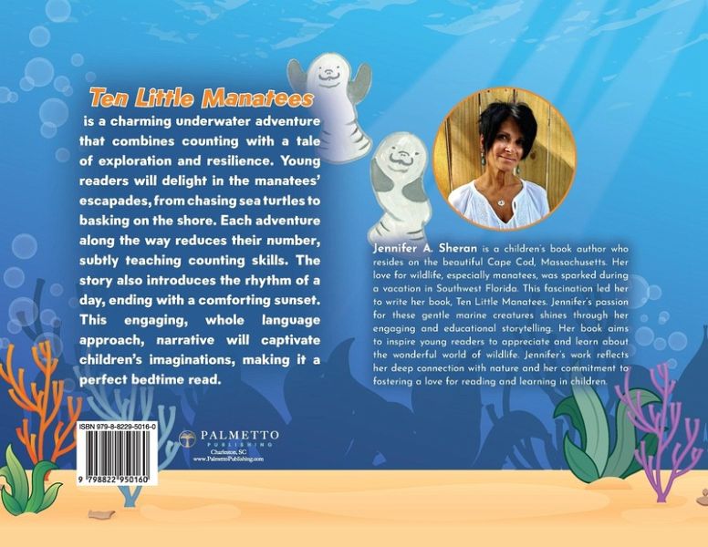 Join the adventure of ten playful manatees as they swim, splash, and explore the sea: each manatee encounters a unique adventure, leaving one behind until there's just one. In Ten Little Manatees, young readers will embark on an enchanting underwater journey, where they will meet ten adorable manatees. These playful creatures, each with their own personality, will captivate the hearts of children as they engage in different adventures. From chasing sea turtles to watching sea birds dive, the manatees' escapades are as diverse as they are exciting. One by one, these manatees discover new experiences, each more exciting than the last. With every page turn, one manatee finds a reason to stay behind, reducing the group's number by one. This cleverly written narrative not only entertains but also subtly introduces the concept of subtraction and counting down from ten, making learning an enjoyable experience. The manatees' adventures are not just about numbers. They also introduce children to different sea creatures and activities. Whether it's a manatee getting a tummy ache from eating too much watermelon or another getting a sunburn from soaking up too much sun, each scenario is relatable and teaches a gentle lesson. As the sun sets and the day ends, the last manatee, having had a day full of fun, heads home. The story concludes on a peaceful note, leaving young readers with a sense of satisfaction and a yearning for more adventures. Ten Little Manatees is more than just a book; it's an adventure that stimulates young minds, encourages curiosity about the natural world, and uses a whole language approach to teach young minds how to read. With its charming storyline and engaging characters, it is sure to become a favorite bedtime story, eagerly anticipated each night. Dive into this delightful tale and let the adventures of the ten little manatees captivate your imagination!