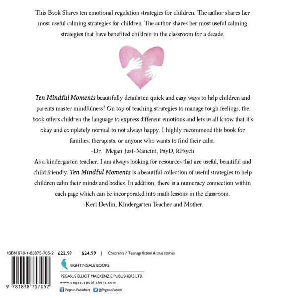 This book shares ten emotional regulation strategies for children. The author shares her most useful calming strategies that have benefited children in the classroom for over a decade. Ten Mindful Moments beautifully details ten quick and easy ways to help children and parents master mindfulness! On top of teaching strategies to manage tough feelings, the book offers children the language to express different emotions and lets us all know that it's okay and completely normal to not always be happy. I highly recommend this book for families, therapists, or anyone who wants to find their calm. - Dr. Megan Just-Mancini, PsyD, RPsych As a kindergarten teach, I am always looking for resources that are useful, beautiful and child friendly. Ten Mindful Moments is a beautiful collection of useful strategies within each page which can be incorporated into math lessons in the classroom. - Keri Devlin, Kindergarten Teacher and Mother