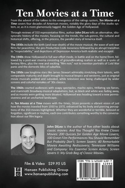 From the advent of the talkies to the emergence of the ratings system, Ten Movies at a Time covers four decades of American movies, notably the glory days of the studio system, or, as it is more glamorously tagged, the Golden Age of Hollywood. Through reviews of 350 representative films, author John DiLeo tells an alternative, idiosyncratic history of the movies, focusing on the trends, the sub-genres, the cultural and historical shifts, offering, in the process, the parallel story of America itself. The 1930s include the birth (and near-death) of the movie musical, the wave of anti-war films for peacetime, the pre-Production Code looseness followed by an abrupt transition to "respectability," and depictions of Depression America both realistic and escapist. The 1940s show Hollywood in full war-effort mode, in battle and on the home front, followed by a post-war cinema consisting of groundbreaking realism as well as a spate of fantasy films, plus the new and exciting "film noir," not to mention portraits of Cold War panic and the domestic bliss of suburbia. The 1950s saw longtime stars like James Stewart admirably stretching their talents, with comparable maturity and depth brought to musical biopics and westerns, just as original movie musicals peaked and subsided, while television was being challenged by wider screens and colorful remakes of ’30s classics. The 1960s courted audiences with soapy spectacles, macho epics, titillating sex farces, and mammoth Broadway-musical adaptations, but, as black and white was fading away, and as movies were getting more bloated, Hollywood was heading toward a new permissiveness and an uncharted landscape. As Ten Movies at a Time moves with the times, DiLeo presents a vibrant vision of just how the movies traveled from 1930 to 1970, enhanced by his lively and piercing perceptions of the 350 movies highlighted. Whether they are wonderful or terrible, beloved or forgotten, significant or routine, each one contributes something worthy to the conversation about our film legacy.
