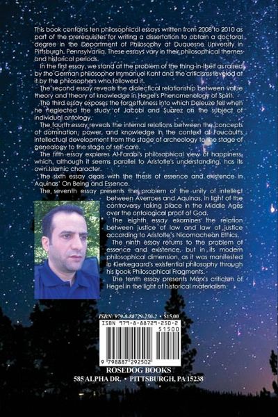 Ten Philosophical Essays By: Kamal A. Shlbei This book contains ten philosophical essays written from 2008 to 2010 as part of the prerequisites for writing a dissertation to obtain a doctoral degree in the Department of Philosophy at Duquesne University in Pittsburgh, Pennsylvania. These essays vary in their philosophical themes and historical periods. In the first essay, we stand at the problem of the thing-in-itself as raised by the German philosopher Immanuel Kant and the criticisms leveled at it by the philosophers who followed it. The second essay reveals the dialectical relationship between value theory and theory of knowledge in Hegel's Phenomenology of Spirit. The third essay exposes the forgetfulness into which Deleuze fell when he neglected the study of Jacobi and Suarez on the subject of individual ontology. The fourth essay reveals the internal relations between the concepts of domination, power, and knowledge in the context of Foucault's intellectual development from the stage of archeology to the stage of genealogy to the stage of self-care. The fifth essay explores Al-Farabi's philosophical view of happiness, which, although it seems parallel to Aristotle's understanding, has its own Islamic character. The sixth essay deals with the thesis of essence and existence in Aquinas' On Being and Essence. The seventh essay presents the problem of the unity of intellect between Averroes and Aquinas, in light of the controversy taking place in the Middle Ages over the ontological proof of God. The eighth essay examines the relation between justice of law and law of justice according to Aristotle's Nicomachean Ethics. The ninth essay returns to the problem of essence and existence, but in its modern philosophical dimension, as it was manifested in Kierkegaard's existential philosophy through his book Philosophical Fragments. The tenth essay presents Marx's criticism of Hegel in the light of historical materialism.
