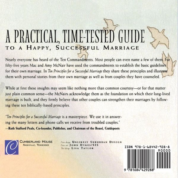 A Practical, Time-Tested Guide to a Happy, Successful Marriage Nearly everyone has heard of the Ten Commandments. Most people can even name a few of them. For fifty-five years Mac and Amy McNair have used the commandments to establish the basic guidelines for their own marriage. In Ten Principles for a Successful Marriage they share these principles and illustrate them with personal stories from their own marriage as well as from couples they have counseled. While at first these insights may seem like nothing more than common courtesy—or for that matter just plain common sense—the McNairs acknowledge them as the foundation on which their long-lived marriage is built, and they firmly believe that other couples can strengthen their marriages by following these ten biblically-based principles. "Ten Principles for a Successful Marriage is a masterpiece. We use it in answering the many letters and phone calls we receive from troubled couples." —Ruth Stafford Peale, Co-founder, Publisher, and Chairman of the Board, Guideposts
