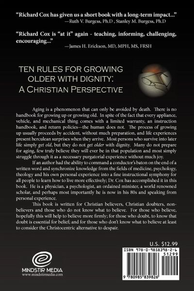 Aging is a phenomenon that can only be avoided by death. There is no handbook for growing up or growing old. In spite of the fact that every appliance, vehicle, and mechanical thing comes with a limited warranty, an instruction handbook, and return policies - the human does not. The process of growing up usually proceeds by accident, without much preparation, and life experiences present herculean surprises when they arrive. Most persons who survive into later life simply get old, but they do not get older with dignity. Many do not prepare for aging, few truly believe they will ever be in that population and most simply struggle through it as a necessary purgatorial experience without much joy. If an author had the ability to command a conductor's baton on the end of a written word and synchronize knowledge from the fields of medicine, psychology, theology and his own personal experience into a fine instructional symphony for all people to learn how to live more effectively; Dr. Cox has accomplished it in this book. He is a physician, a psychologist, an ordained minister, a world renowned scholar, and perhaps most importantly he is now in his 80s and speaking from personal experience.