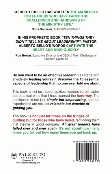 This book is not just about spiritual leadership principles but practical ones that I have learned the hard way. The application is not just simple but empowering, and the experiences are not just relatable but capable of guiding you. This book is not just for those on the fringes of quitting but for those who have failed, reminding them that they're in good company. All great leaders have failed repeatedly. It's not about how many times you fall but how many times you get back up. This book inspires and encourages you wherever you are on the leadership journey. Whether you're in a leadership position at church or a business or have a business, I believe this book will speak to you right where you are.