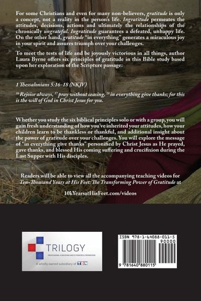 About the book Ten-Thousand Years at His Feet: The Transforming Power of Gratitude by Laura Vice Byrne For some Christians and even for many non-believers, gratitude is only a concept, not a reality in the person’s life. Ingratitude permeates the attitudes, decisions, actions and ultimately the relationships of the chronically ungrateful. Ingratitude guarantees a defeated, unhappy life. On the other hand, gratitude "in everything" generates a miraculous joy in your spirit and assures triumph over your challenges. To meet the tests of life and be joyously victorious in all things, author Laura Byrne offers six principles of gratitude in this Bible study based upon her exploration of the Scripture passage: Thessalonians 5:16-18 (NKJV) 6 Rejoice always, 7 pray without ceasing, 8 in everything give thanks; for this is the will of God in Christ Jesus for you. Whether you study the six biblical principles solo or with a group, you will gain fresh understanding of how you’ve inherited your attitudes, how your children learn to be thankless or thankful, and additional insight about the power of gratitude over your challenges. You will explore the message of "in everything give thanks" personified by Christ Jesus as He prayed, gave thanks, and blessed His coming suffering and crucifixion during the Last Supper with His disciples.