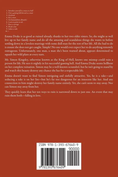 Introduce yourself to a man at a ball Visit a gaming hell dressed as a man Get foxed Kiss a man Get banned from Almacks's Learn to paint in oils Race a carriage Break a law Seduce a rake ? Emma Drake is as good as ruined already, thanks to her two older sisters. So, she might as well live up to her family name and do all the amusing and scandalous things she wants to before settling down in a loveless marriage with some dull man for the rest of her life. All she had to do is ensure she does not get caught. Simple! No one would ever expect her to do anything remotely outrageous. Unfortunately, one man, a man she's been warned about, appears determined to squash her wild plans at every turn. Mr. Simon Kingsley, otherwise known as the King of Hell, knows one misstep could ruin a person for life. He sees it nightly in his successful gaming hell. And Emma Drake seems hellbent on her complete ruination. Simon may be a well-known scoundrel, but he isn't going to stand by and watch this beauty destroy any chance she has for a respectable life. Emma doesn't want to find Simon intriguing and sinfully attractive. Yes, he is a rake-and seducing a rake is on her list-but he's far too dangerous for an innocent like her. And any connection to him might destroy her family name entirely. Yet, she can't seem to stay away. Nor can Simon stay away from her. They quickly learn that her ten ways to ruin is narrowed down to just one. An event that may ruin them both-falling in love.