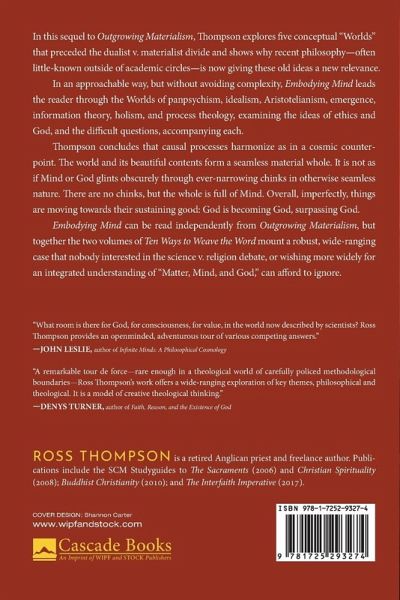 In this sequel to Outgrowing Materialism, Thompson explores five conceptual ""Worlds"" that preceded the dualist v. materialist divide and shows why recent philosophy--often little-known outside of academic circles--is now giving these old ideas a new relevance. In an approachable way, but without avoiding complexity, Embodying Mind leads the reader through the Worlds of panpsychism, idealism, Aristotelianism, emergence, and information theory, holism, and process theology, examining the ideas of ethics and God, and the difficult questions, accompanying each. Thompson concludes that causal processes harmonize as in a cosmic counterpoint. The world and its beautiful contents form a seamless material whole. It is not as if Mind or God glints obscurely through ever-narrowing chinks in otherwise seamless nature. There are no chinks, but the whole is full of Mind. Overall, imperfectly, things are moving towards their sustaining good: God is becoming God, surpassing God. Embodying Mind can be read independently from Outgrowing Materialism, but together the two volumes of Ten Ways to Weave the Word mount a robust, wide-ranging case that nobody interested in the science v. religion debate, or wishing more widely for an integrated understanding of ""Matter, Mind and God,"" can afford to ignore.