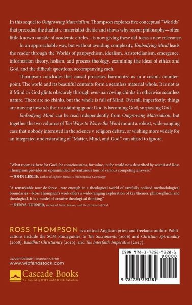 In this sequel to Outgrowing Materialism, Thompson explores five conceptual ""Worlds"" that preceded the dualist v. materialist divide and shows why recent philosophy--often little-known outside of academic circles--is now giving these old ideas a new relevance. In an approachable way, but without avoiding complexity, Embodying Mind leads the reader through the Worlds of panpsychism, idealism, Aristotelianism, emergence, and information theory, holism, and process theology, examining the ideas of ethics and God, and the difficult questions, accompanying each. Thompson concludes that causal processes harmonize as in a cosmic counterpoint. The world and its beautiful contents form a seamless material whole. It is not as if Mind or God glints obscurely through ever-narrowing chinks in otherwise seamless nature. There are no chinks, but the whole is full of Mind. Overall, imperfectly, things are moving towards their sustaining good: God is becoming God, surpassing God. Embodying Mind can be read independently from Outgrowing Materialism, but together the two volumes of Ten Ways to Weave the Word mount a robust, wide-ranging case that nobody interested in the science v. religion debate, or wishing more widely for an integrated understanding of ""Matter, Mind and God,"" can afford to ignore.
