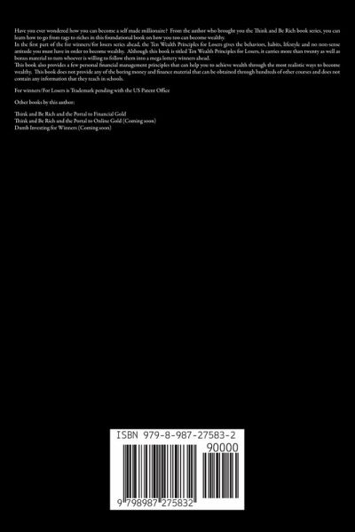 Have you ever wondered how you can become a self made millionaire? From the author who brought you the Think and Be Rich book series, you can learn how to go from rags to riches in this foundational book on how you too can become wealthy. In the first part of the for winners/for losers series ahead, the Ten Wealth Principles for Losers gives the behaviors, habits, lifestyle and no non-sense attitude you must have in order to become wealthy. Although this book is titled Ten Wealth Principles for Losers, it carries more than twenty as well as bonus material to turn whoever is willing to follow them into a mega lottery winners ahead. This book also provides a few personal financial management principles that can help you to achieve wealth through the most realistic ways to become wealthy. This book does not provide any of the boring money and finance material that can be obtained through hundreds of other courses and does not contain any information that they teach in schools. For winners/For Losers is Trademark pending with the US Patent Office Other books by this author: Think and Be Rich and the Portal to Financial Gold Think and Be Rich and the Portal to Online Gold (Coming soon) Dumb Investing for Winners (Coming soon)