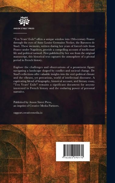 "Ten Years' Exile" offers a unique window into 19th-century France through the eyes of Anne Louise Germaine Necker, the Baroness de Stael. These memoirs, written during her years of forced exile from France under Napoleon, provide a compelling account of intellectual life and political turmoil. First published by her son from the original manuscript, this historical text captures the atmosphere of a pivotal period in French history. Explore the challenges and observations of a prominent figure navigating a landscape shaped by conflict and societal change. De Stael's reflections offer valuable insights into the era's political climate and the vibrant, yet precarious, world of intellectual discourse. A captivating blend of biography, historical account, and literary essay, "Ten Years' Exile" remains a significant document for anyone interested in French history and the enduring power of personal narrative. This work has been selected by scholars as being culturally important, and is part of the knowledge base of civilization as we know it. This work is in the public domain in the United States of America, and possibly other nations. Within the United States, you may freely copy and distribute this work, as no entity (individual or corporate) has a copyright on the body of the work. Scholars believe, and we concur, that this work is important enough to be preserved, reproduced, and made generally available to the public. We appreciate your support of the preservation process, and thank you for being an important part of keeping this knowledge alive and relevant.