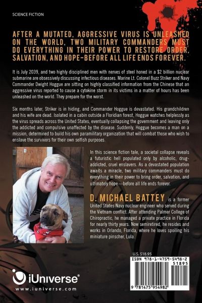 It is July 2039, and two highly disciplined men with nerves of steel honed in a $2 billion nuclear submarine are obsessively discussing infectious diseases. Marine Lt. Colonel Buzz Striker and Navy Commander Dwight Hoggue are sitting on highly classified information from the Chinese that an aggressive virus reported to cause a cytokine storm in its victims in a matter of hours has been unleashed on the world. They prepare for the worst. Six months later, Striker is in hiding, and Commander Hoggue is devastated. His grandchildren and his wife are dead. Isolated in a cabin outside a Floridian forest, Hoggue watches helplessly as the virus spreads across the United States, eventually collapsing the government and leaving only the addicted and compulsive unaffected by the disease. Suddenly, Hoggue becomes a man on a mission, determined to build his own paramilitary organization that will combat those who wish to enslave the survivors for their own selfish purposes. In this science fiction tale, a societal collapse reveals a futuristic hell populated only by alcoholic, drug-addicted, cruel enslavers. As a devastated population awaits a miracle, two military commanders must do everything in their power to bring order, salvation, and ultimately hope-before all life ends forever.