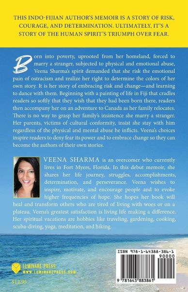This Indo-Fijian author's memoir is a story of risk, courage, and determination. Ultimately, it's a story of the human spirit's triumph over fear. Born into poverty, uprooted from her homeland, forced to marry a stranger, subjected to physical and emotional abuse, Veena Sharma's spirit demanded that she risk the emotional pain of ostracism and realize her right to determine the colors of her own story. It is her story of embracing risk and change-and learning to dance with them. Beginning with a painting of life in Fiji that cradles readers so softly that they wish that they had been born there, readers then accompany her on an adventure to Canada as her family relocates. There is no way to grasp her family's insistence she marry a stranger. Her parents, victims of cultural conformity, insist she stay with him regardless of the physical and mental abuse he inflicts. Veena's choices inspire readers to deny fear its power and to embrace change so they can become the authors of their own stories.