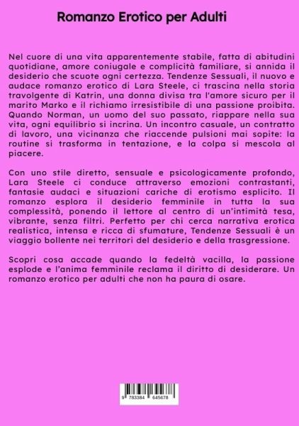 Nel cuore di una vita apparentemente stabile, fatta di abitudini quotidiane, amore coniugale e complicità familiare, si annida il desiderio che scuote ogni certezza. Tendenze Sessuali, il nuovo e audace romanzo erotico di Lara Steele, ci trascina nella storia travolgente di Katrin, una donna divisa tra l'amore sicuro per il marito Marko e il richiamo irresistibile di una passione proibita. Quando Norman, un uomo del suo passato, riappare nella sua vita, ogni equilibrio si incrina. Un incontro casuale, un contratto di lavoro, una vicinanza che riaccende pulsioni mai sopite: la routine si trasforma in tentazione, e la colpa si mescola al piacere.Con uno stile diretto, sensuale e psicologicamente profondo, Lara Steele ci conduce attraverso emozioni contrastanti, fantasie audaci e situazioni cariche di erotismo esplicito. Il romanzo esplora il desiderio femminile in tutta la sua complessità, ponendo il lettore al centro di un'intimità tesa, vibrante, senza filtri. Perfetto per chi cerca narrativa erotica realistica, intensa e ricca di sfumature, Tendenze Sessuali è un viaggio bollente nei territori del desiderio e della trasgressione.Scopri cosa accade quando la fedeltà vacilla, la passione esplode e l'anima femminile reclama il diritto di desiderare. Un romanzo erotico per adulti che non ha paura di osare.
