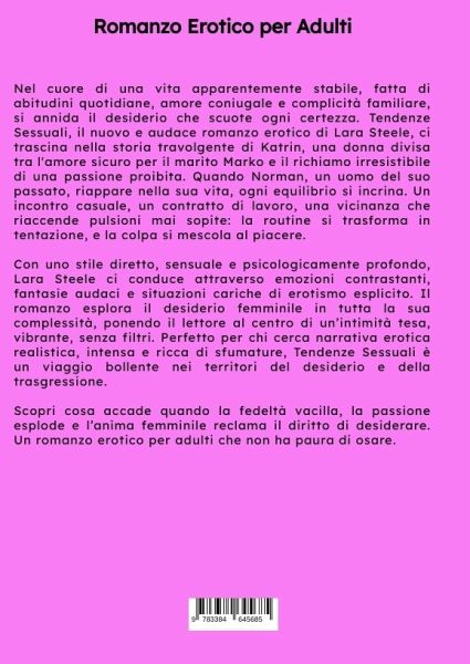 Nel cuore di una vita apparentemente stabile, fatta di abitudini quotidiane, amore coniugale e complicità familiare, si annida il desiderio che scuote ogni certezza. Tendenze Sessuali, il nuovo e audace romanzo erotico di Lara Steele, ci trascina nella storia travolgente di Katrin, una donna divisa tra l'amore sicuro per il marito Marko e il richiamo irresistibile di una passione proibita. Quando Norman, un uomo del suo passato, riappare nella sua vita, ogni equilibrio si incrina. Un incontro casuale, un contratto di lavoro, una vicinanza che riaccende pulsioni mai sopite: la routine si trasforma in tentazione, e la colpa si mescola al piacere.Con uno stile diretto, sensuale e psicologicamente profondo, Lara Steele ci conduce attraverso emozioni contrastanti, fantasie audaci e situazioni cariche di erotismo esplicito. Il romanzo esplora il desiderio femminile in tutta la sua complessità, ponendo il lettore al centro di un'intimità tesa, vibrante, senza filtri. Perfetto per chi cerca narrativa erotica realistica, intensa e ricca di sfumature, Tendenze Sessuali è un viaggio bollente nei territori del desiderio e della trasgressione.Scopri cosa accade quando la fedeltà vacilla, la passione esplode e l'anima femminile reclama il diritto di desiderare. Un romanzo erotico per adulti che non ha paura di osare.
