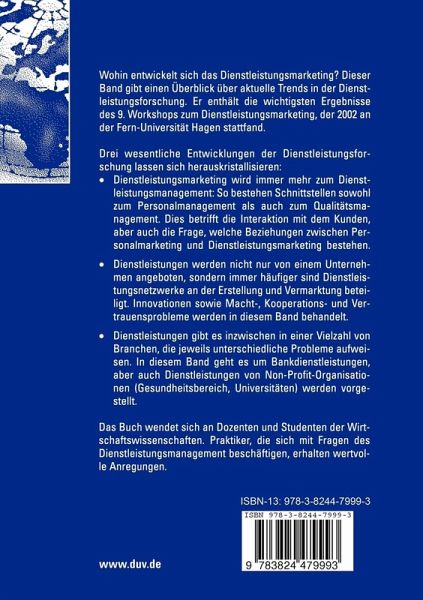 Wohin entwickelt sich das Dienstleistungsmarketing? Dieser Band gibt einen Überblick über aktuelle Trends in der Dienstleistungsforschung. Er enthält die wichtigsten Ergebnisse des 9. Workshops zum Dienstleistungsmarketing, der 2002 an der Fern-Universität Hagen stattfand.