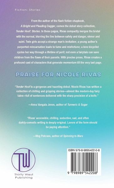From the author of the flash fiction chapbook, A Bright and Pleading Dagger, comes the debut story collection, Tender Hoof: Stories. In these pages, Rivas compactly merges the brutal with the surreal, blurring the line between safety and danger, sinner and saint. Twin girls accept a strange man's invitation; a young author's purported reincarnation leads to fame and misfortune; a lone bicyclist cycles her way through a lifetime of peril; not even a fairytale can save children from the flaws of their parents. With blade-sharp prose, Rivas creates a profound cast of characters that generate momentum till the very last page.