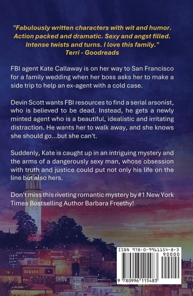 "Fabulously written characters with wit and humor. Action packed and dramatic. Sexy and angst filled. Intense twists and turns. I love this family." Terri - Goodreads FBI agent Kate Callaway is on her way to San Francisco for a family wedding when her boss asks her to make a side trip to help an ex-agent with a cold case. Devin Scott wants FBI resources to find a serial arsonist, who is believed to be dead. Instead, he gets a newly minted agent who is a beautiful, idealistic and irritating distraction. He wants her to walk away, and she knows she should go...but she can't. Suddenly, Kate is caught up in an intriguing mystery and the arms of a dangerously sexy man, whose obsession with truth and justice could put not only his life on the line but also hers. Fans of Melinda Leigh, Kendra Elliott, Jennifer Probst, Marie Force and Robyn Carr will love this captivating romantic mystery by #1 New York Times Bestselling Author Barbara Freethy! The Callaways Family series offers romance, mystery and family drama in each standalone novel, and the books include some of your favorite storylines: alpha heroes, firefighter romance, girl next door, love at first sight, enemies to lovers, opposites attract, grumpy sunshine, meet cute, instalove, and second chance at love. Each book stands on its own. No cliffhangers! What the readers are saying... "Wow, I couldn't put it down once I started reading! Read Barbara Freethy's Tender Is The Night and immerse yourself in yet another Callaways saga." Virginia - Goodreads "I love Barbara Freethy books and this story did not disappoint. The pace was steady and before I knew it, I was at the end of the story. I look forward to learning more about Kate and Mia's family. 5 stars!" Debbie - Goodreads "Author Barbara Freethy does a masterful job of creating a plot that draws the reader to a suspenseful climax. With each new book in the Callaway series, she brings together a wonderful blend of love, family and suspense." RJ - Goodreads "The characters are complex and grow throughout the story. The twists & turns of the plot keep you involved. I was caught from the beginning and could not put it down." Pam - Goodreads