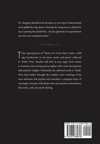 "Dr. Slaughter fumbled with the dozen or more keys he had attached to his gilded key ring, forever choosing the wrong one in a futile first try at opening the jeweled box...his eyes glistened as he gazed down into the secret contained within." These opening lines of "Heart of a Great Man" make a chilling introduction to the short stories and poetry collected in Tender Verses. Readers will find an easy segue from stories to romantic and stirring poems replete with erotic descriptions and sardonic insights. Ultimately, the collected works in Tender Verses lead readers through the complex inner workings of human emotions and psyches and introduce a poignant array of seemingly everyday individuals who each possess extraordinary life stories, rich and worth sharing.