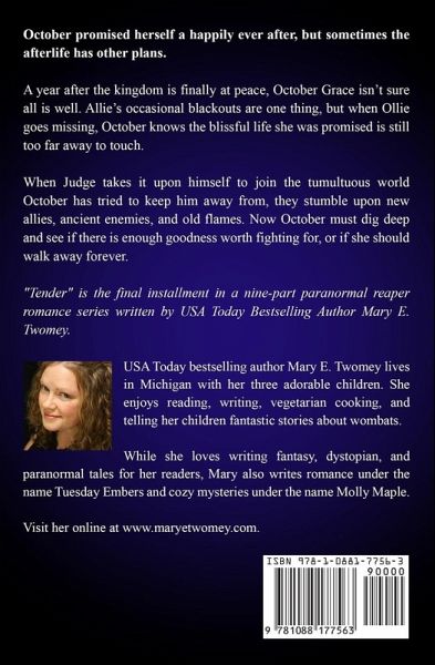 October promised herself a happily ever after, but sometimes the afterlife has other plans. A year after the kingdom is finally at peace, October Grace isn't sure all is well. Allie's occasional blackouts are one thing, but when Ollie goes missing, October knows the blissful life she was promised is still too far away to touch. When Judge takes it upon himself to join the tumultuous world October has tried to keep him away from, they stumble upon new allies, ancient enemies, and old flames. Now October must dig deep and see if there is enough goodness worth fighting for, or if she should walk away forever. If you love Bella Forrest, Cassandra Clare, and falling in love with the bad boy, you'll devour the "Terraway" series by Mary E. Twomey. "Tender" is the final book in a 9-part paranormal reaper romance series written by USA Today Bestselling Author Mary E. Twomey.