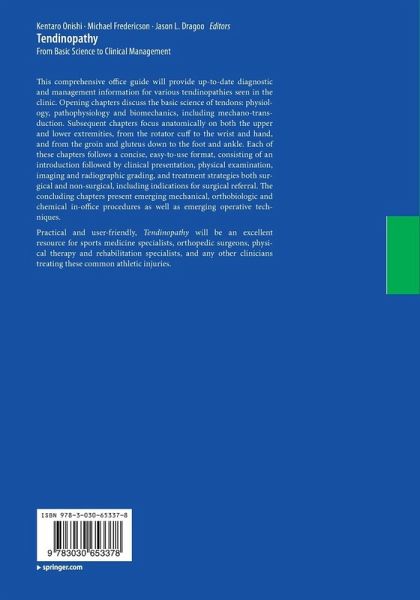 Biological and Biomechanical Adaptation of Young and Aging Tendons to Exercise.- The Pathogenic Mechanisms of Tendinopathy.- Rotator Cuff Tendon.- Biceps Tendon.- Common Extensor Tendon/Common Flexor Tendon.- Tendons in Wrist and Hand.- Rectus Abdominis and Hip Adductor Tendon.- Proximal Hamstring Tendinopathy.- Lateral Gluteal Tendinopathy.- Quadriceps Tendon.- Patellar Tendinopathy.- Distal Hamstring, Pes Anserine, Popliteal Tendinopathy.- Peroneal Tendinopathy.- Anterior/Dorsal Ankle Tendons.- Medial Ankle/Plantar Foot Tendinopathy.- Achilles Tendon.- Plantar Fascia.- Office-Based Mechanical Procedures for Tendons.- Office-Based Orthobiologic Procedures for Tendons.- Emerging In-Office Procedures: Chemical Ablation, Dextrose Hyperosmolar Injections.- Emerging Operative Procedures for Tendons.