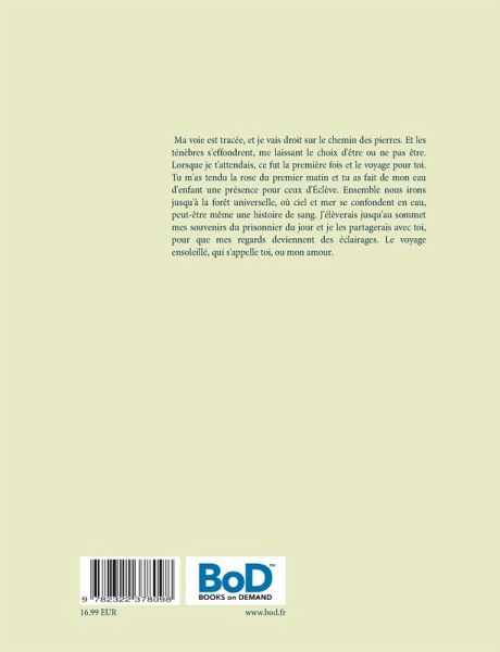 Ma voie est tracée, et je vais droit sur le chemin des pierres. Et les ténèbres s'effondrent, me laissant le choix d'être ou ne pas être. Lorsque je t'attendais, ce fut la première fois et le voyage pour toi. Tu m'as tendue la rose du premier matin et tu as fait de mon eau d'enfant une présence pour ceux d'Éclève. Ensemble nous irons jusqu'à la forêt universelle, où ciel et mer se confondent en eau, peut-être même une histoire de sang. J'élèverais jusqu'au sommet mes souvenirs du prisonnier du jour et je les partagerais avec toi, pour que mes regards deviennent des éclairages. Le voyage ensoleillé, qui s'appelle toi, ou mon amour.